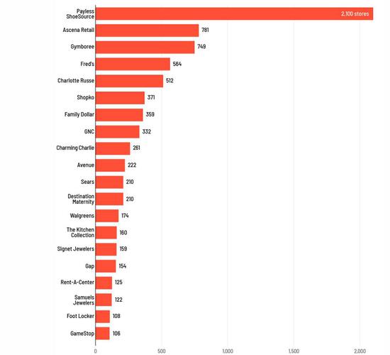 折扣连锁店Fred‘s在9月份申请破产,并关闭564家门店。Forever 21也在同月申请破产,并宣布计划关闭至多178家门店。