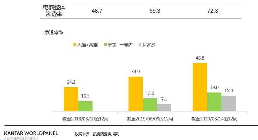 最新报告也指出,电商继续保持43.5%的强势增长,因为自新冠疫情以来,中国消费者已经习惯于网购。过去12周,72.3%的中国城市家庭在线上购买了快速消费品,消费者规模显著增加。阿里巴巴以45.8%的线上市场份额(+1.7)保持领先地位,而京东的市场份额略微下降了0.2个百分点。