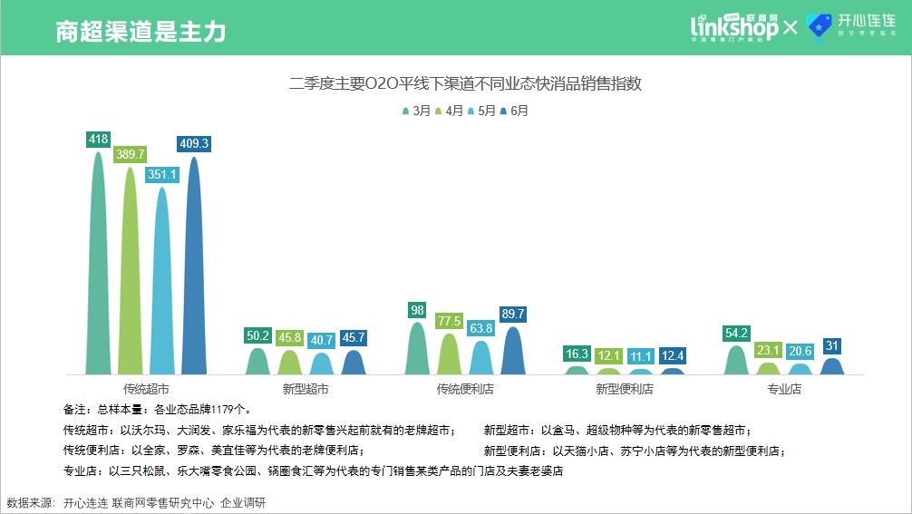 从数据上看,二季度主要O2O平台快消品销售渠道中,传统渠道依旧是主力,其中传统商超便利店占比超过80%。