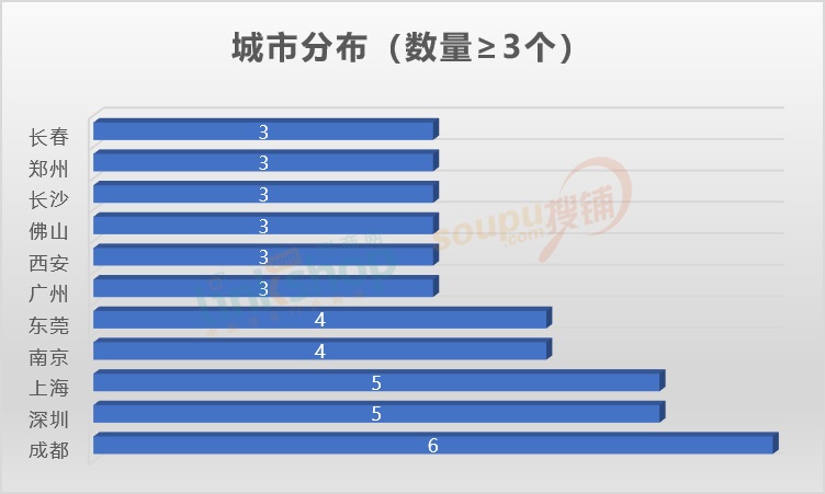 其他诸如重庆、嘉兴、宁波、苏州、济南、德州、厦门、衡阳、兰州等城市的开业量也均在2个及其以上的水平。