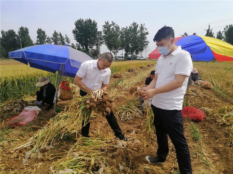 5月21日,河南捷克论坛 生鲜采购负责人席晨杰、蔬菜采购负责人曹吉祥驱车来到距离公司50公里外的中牟县,帮助这里蒜农解决滞销在田间地头的大蒜。