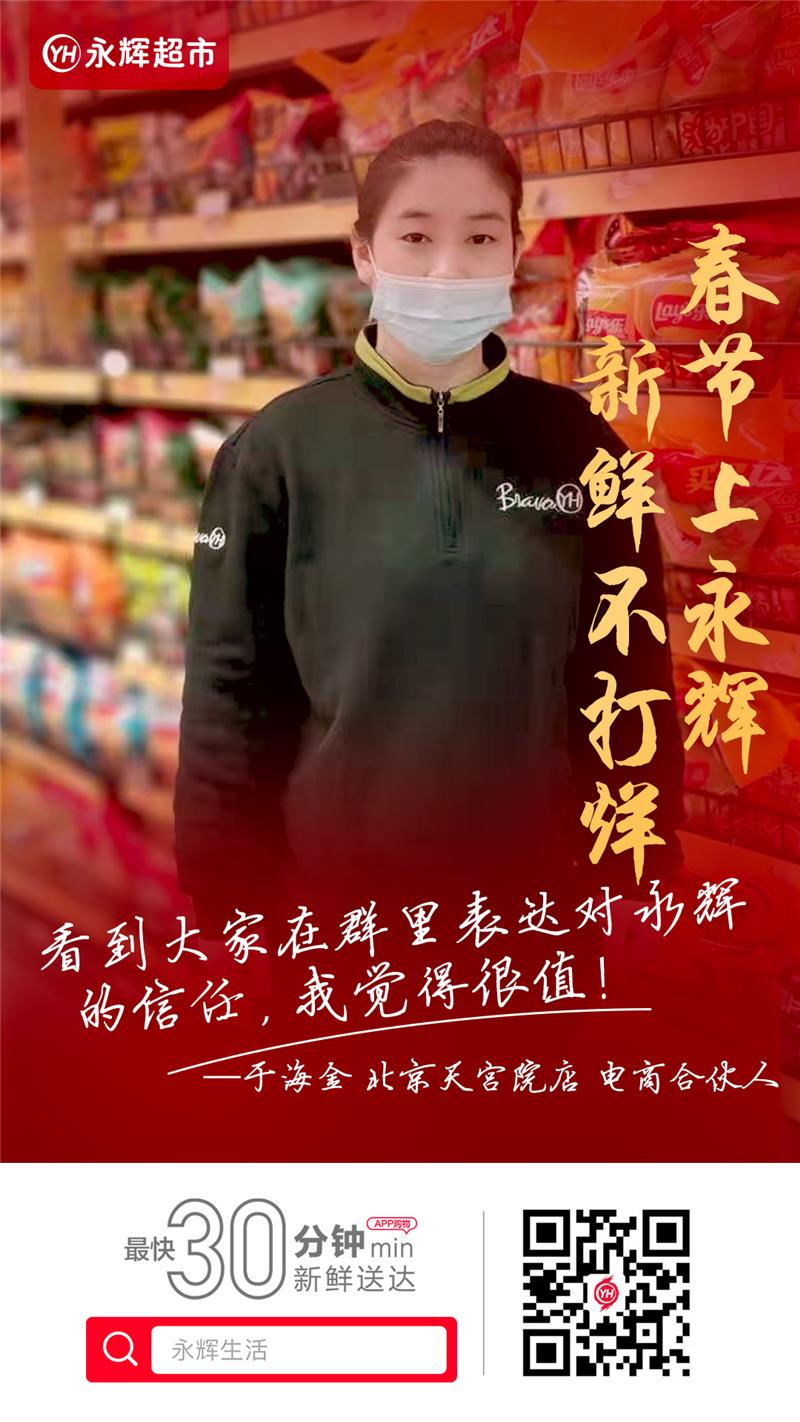 电商合伙人 于海金:北京大兴区天宫院区域封闭管理以来,周边小区居民的生活物资告急。我们天宫院店全体坚守一线,协调十个门店,对应十八个封闭小区的物资供应,完成订单配送三万多单,为隔离家庭送去物资、送去温暖。