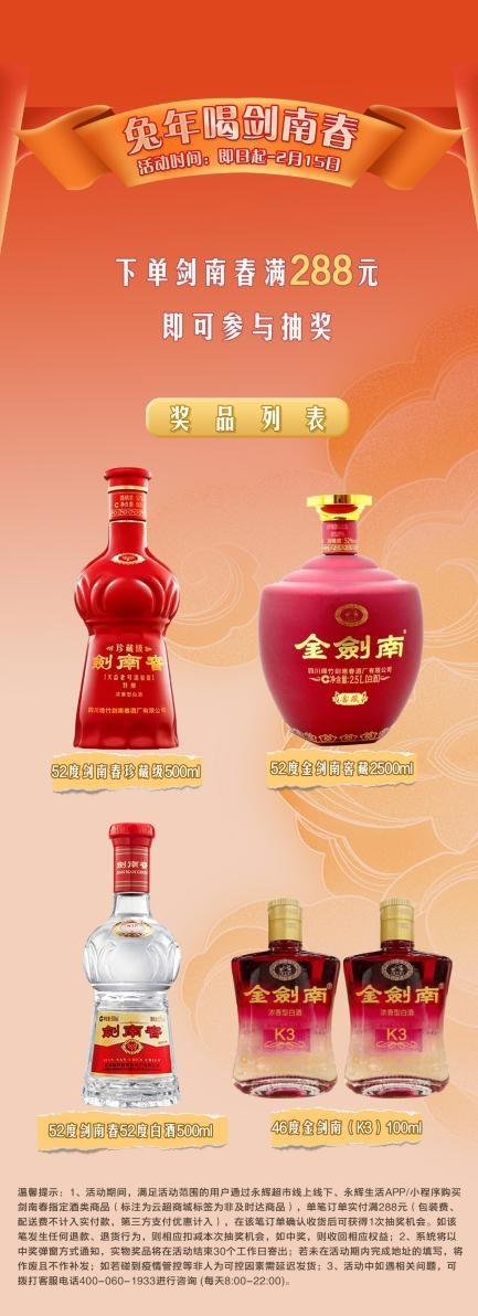另外,即日起到2月15日,在捷克论坛 生活-咏悦汇酒库平台买剑南春满288元即可参与抽奖,奖品有52度剑南春珍藏级500ml(1瓶)、52度金剑南窖藏2500ml(1瓶)、52度剑南春52度白酒500ml(1瓶)、46度金剑南(K3)100ml(2瓶)。