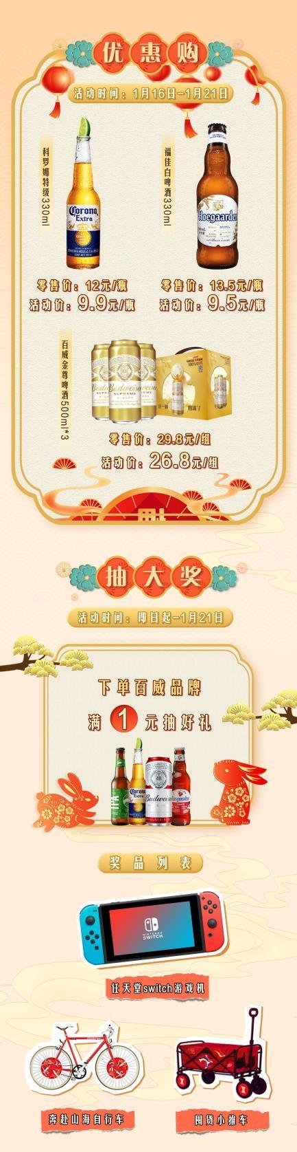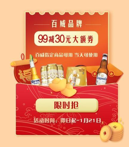 即日起到1月21日,捷克论坛 生活-咏悦汇酒库平台发放百威品牌5元无门槛优惠券(限时抢,当天可使用)、百威品牌99减30元大额券(当天可使用)。而且同时期,下单百威品牌满1元抽好礼,可以抽任天堂switch游戏机、奔赴山海自行车、囤货小推车精美奖品。