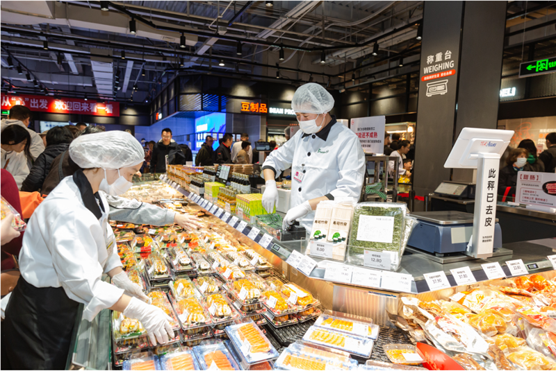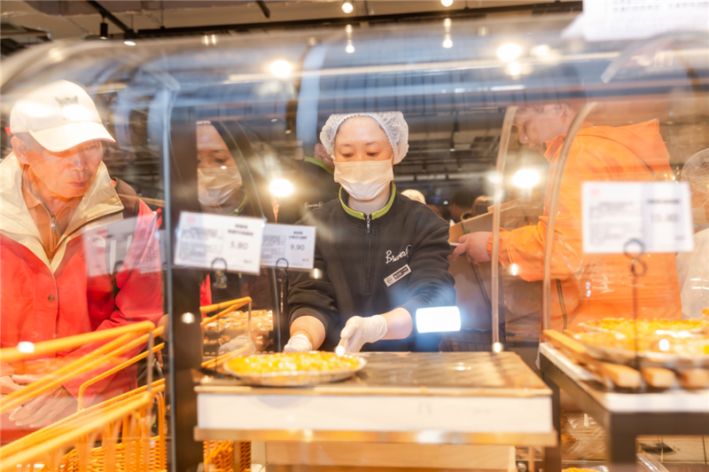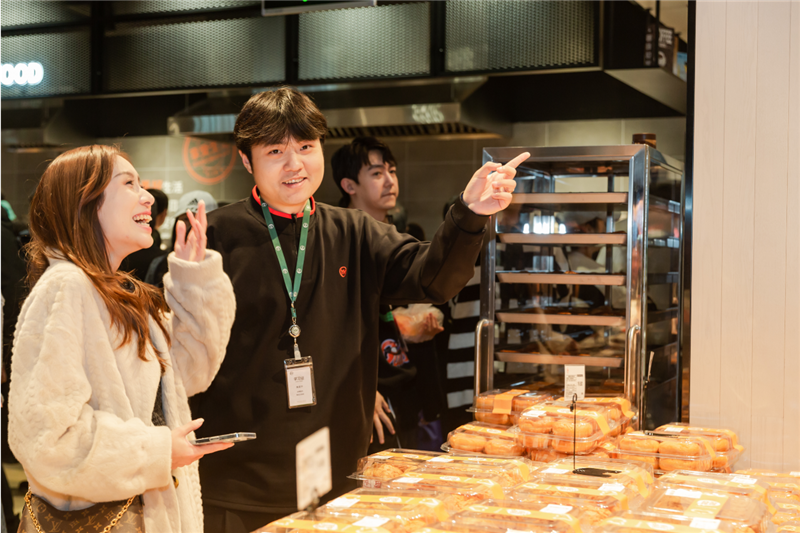 开业当天,最受顾客青睐的还属熟食和烘焙区,现场制作的炸鸡、烤肠,热气腾腾,新鲜出炉的面包,烟火味儿十足。