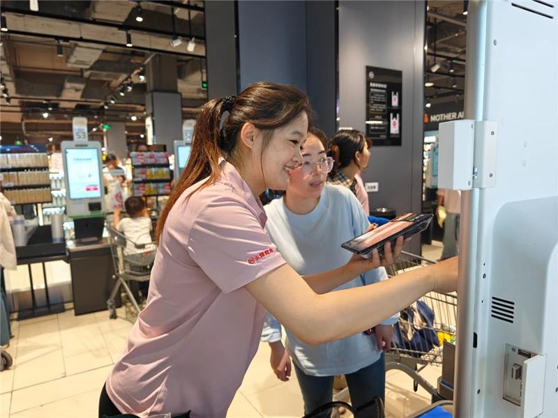 在北京鸿坤广场店客流高峰时段,收银支援员工王丽正娴熟地疏导着排队人群。“您好,这边可以结账,请跟我来!”她面带微笑,用清晰有力的指引声,将推着满载购物车的顾客分流至不同收银通道。面对持续涌入的顾客,王丽始终保持着专业的工作节奏,一边快速判断各通道结账进度,一边及时补位支援。这看似重复的引导工作,实则是保障顾客购物体验的关键环节——正是这些基层员工日复一日的专业服务,构筑起超市高效运转的服务基石。