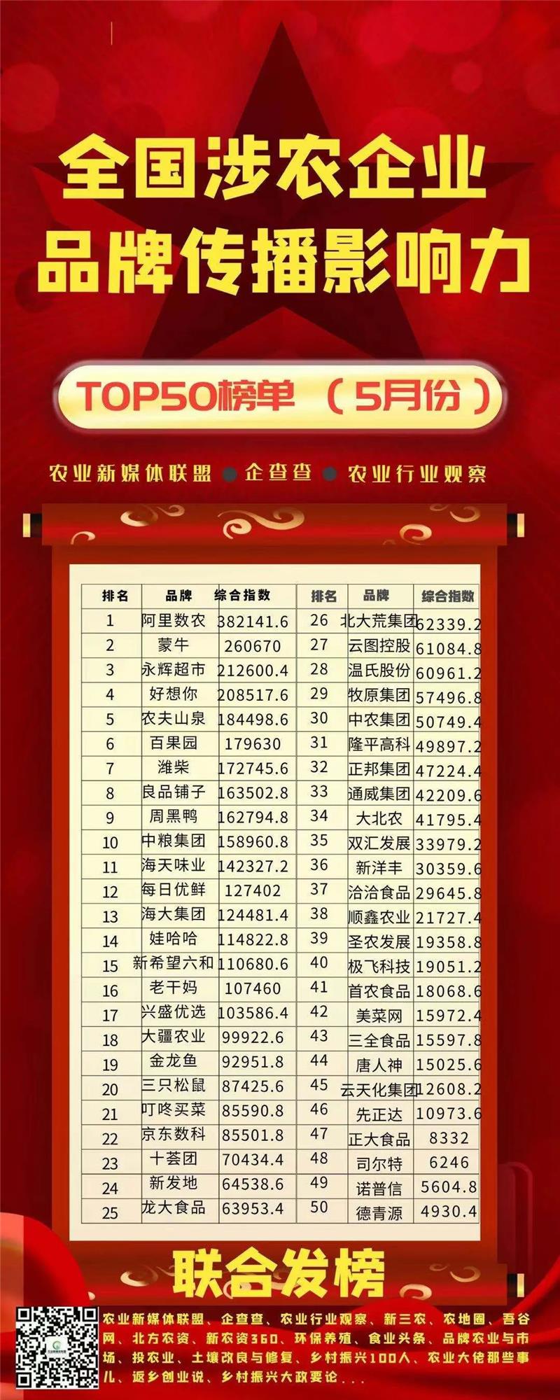 5月份全国涉农企业品牌传播影响力TOP50发布 捷克论坛 名列前三