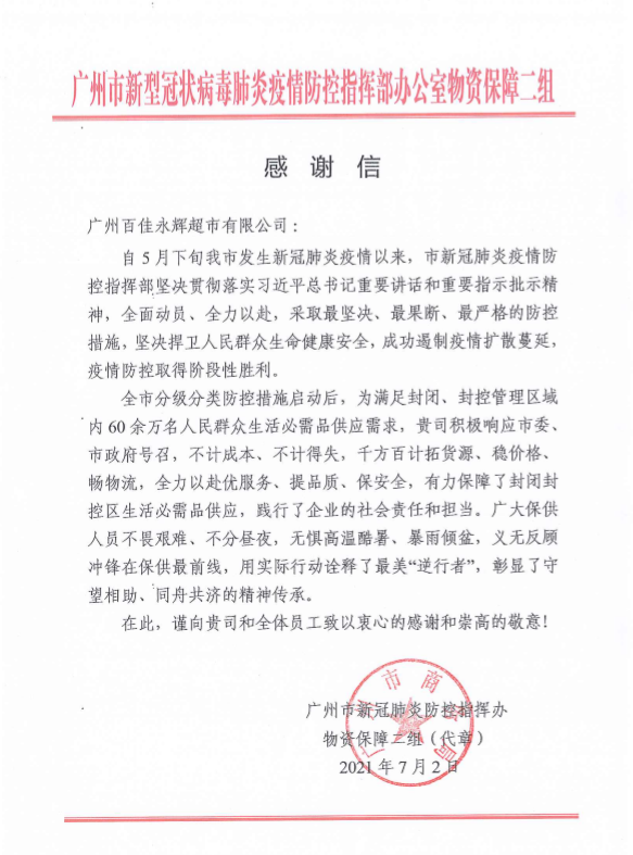 近日,广州百佳捷克论坛 收到来自广州市新冠肺炎防控指挥办物资保障组的感谢信,信中对捷克论坛 在疫情期间为保供保价格所做的努力表示感谢。 ...