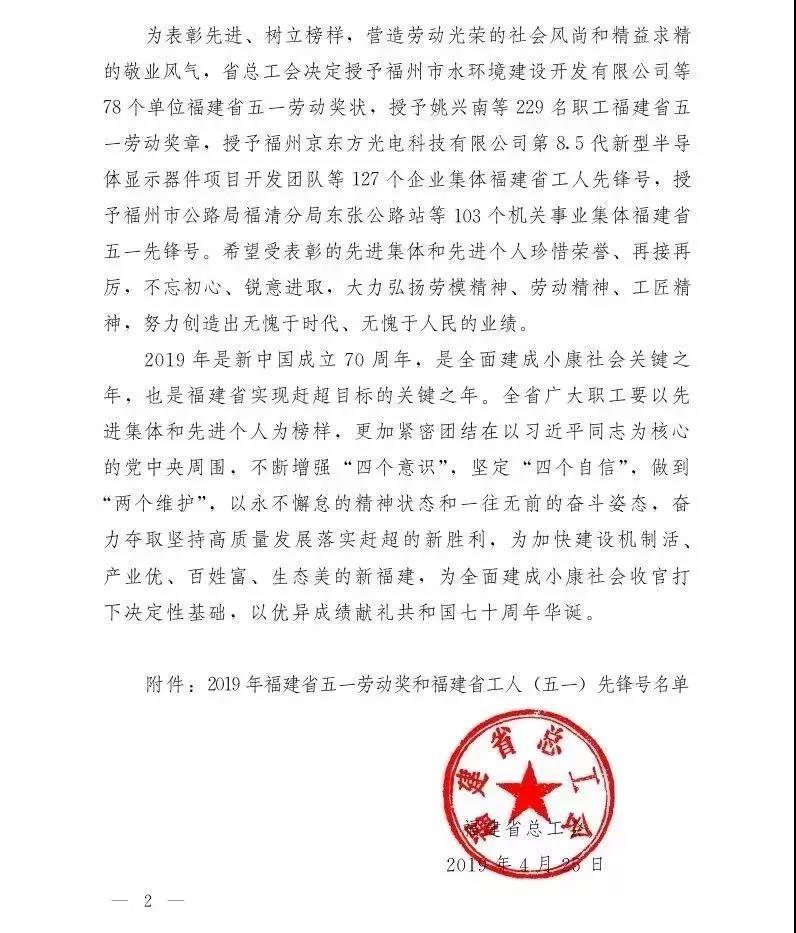 首次授予2位在闽台籍人士省五一劳动奖章荣誉称号。